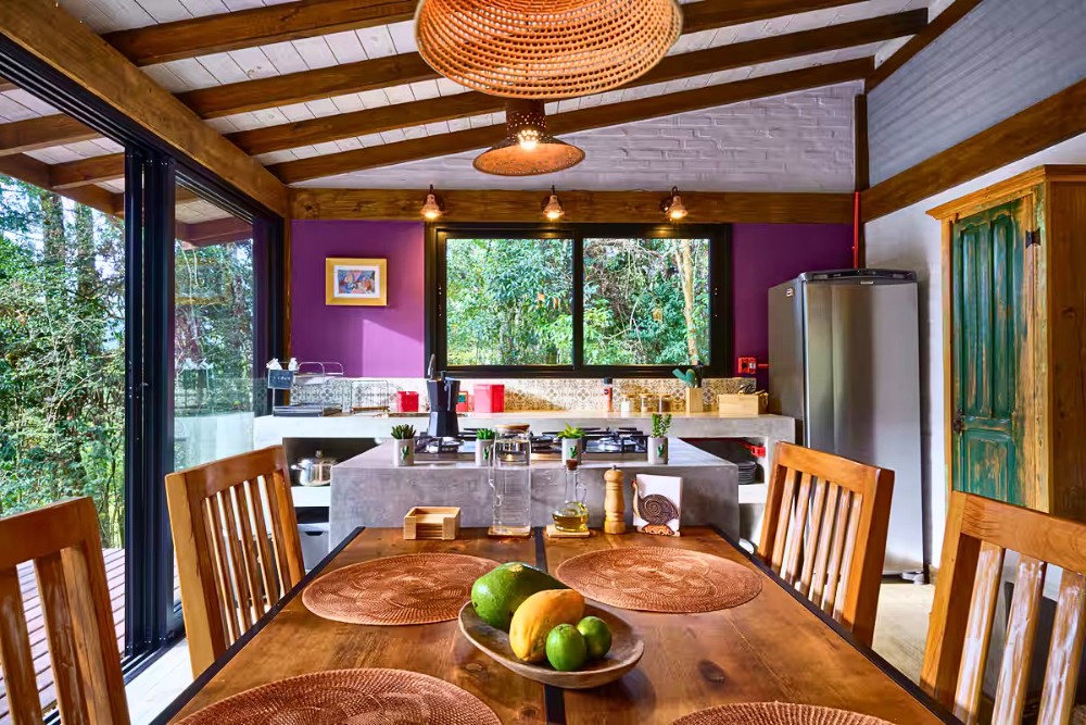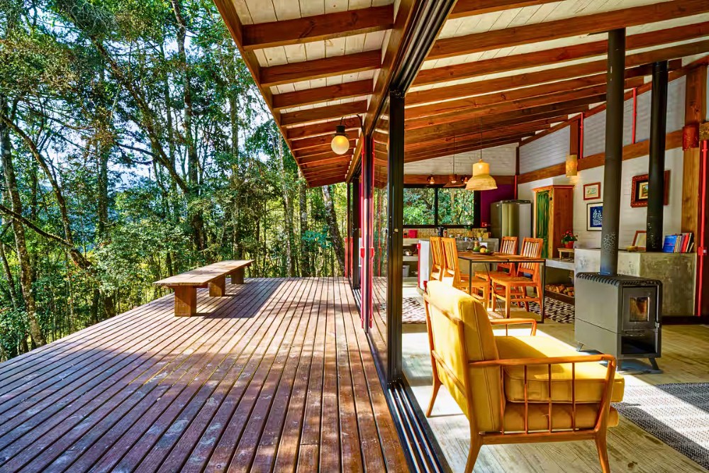 O grande diferencial são as portas de correr em vidro que se abrem integralmente. Quando abertas, o living e o deck de madeira fundem-se ao bosque de 5.500 m², eliminando as fronteiras entre o conforto interno e a energia vibrante das Araucárias e Manacás. É a sensação de flutuar sobre a floresta.