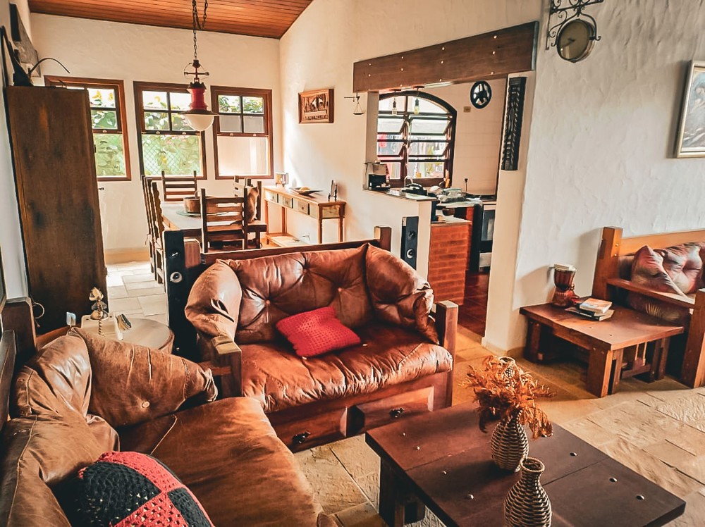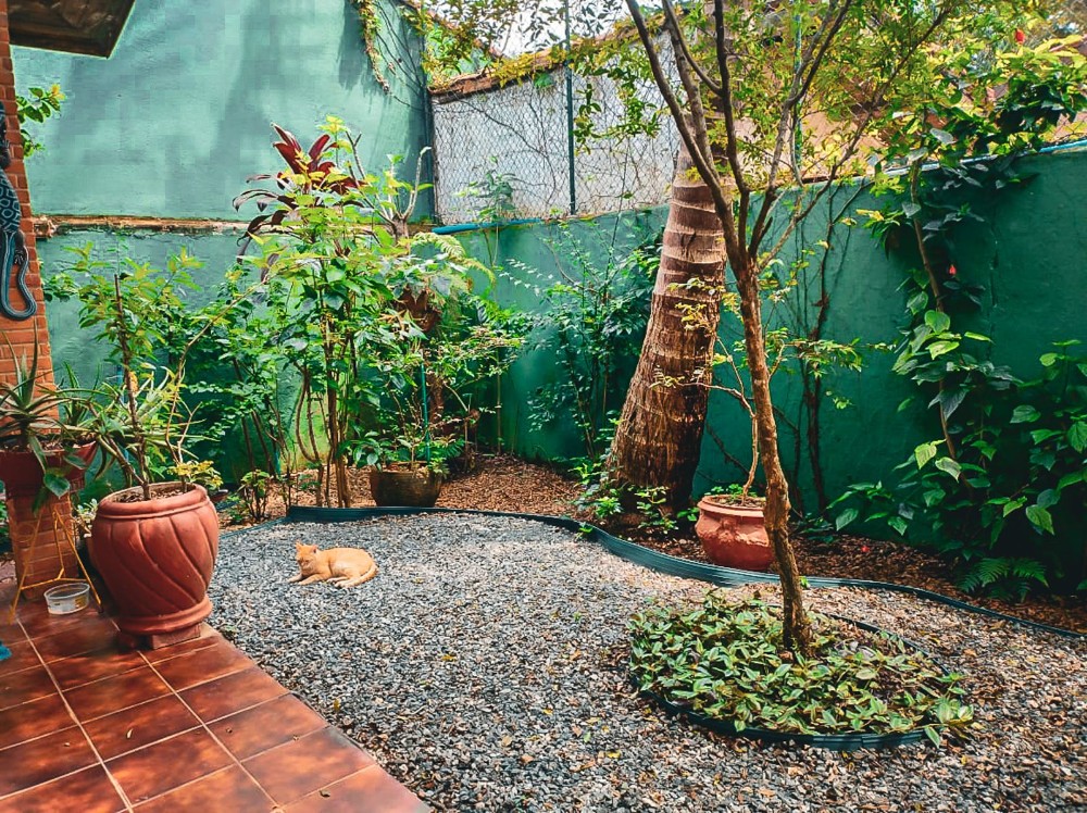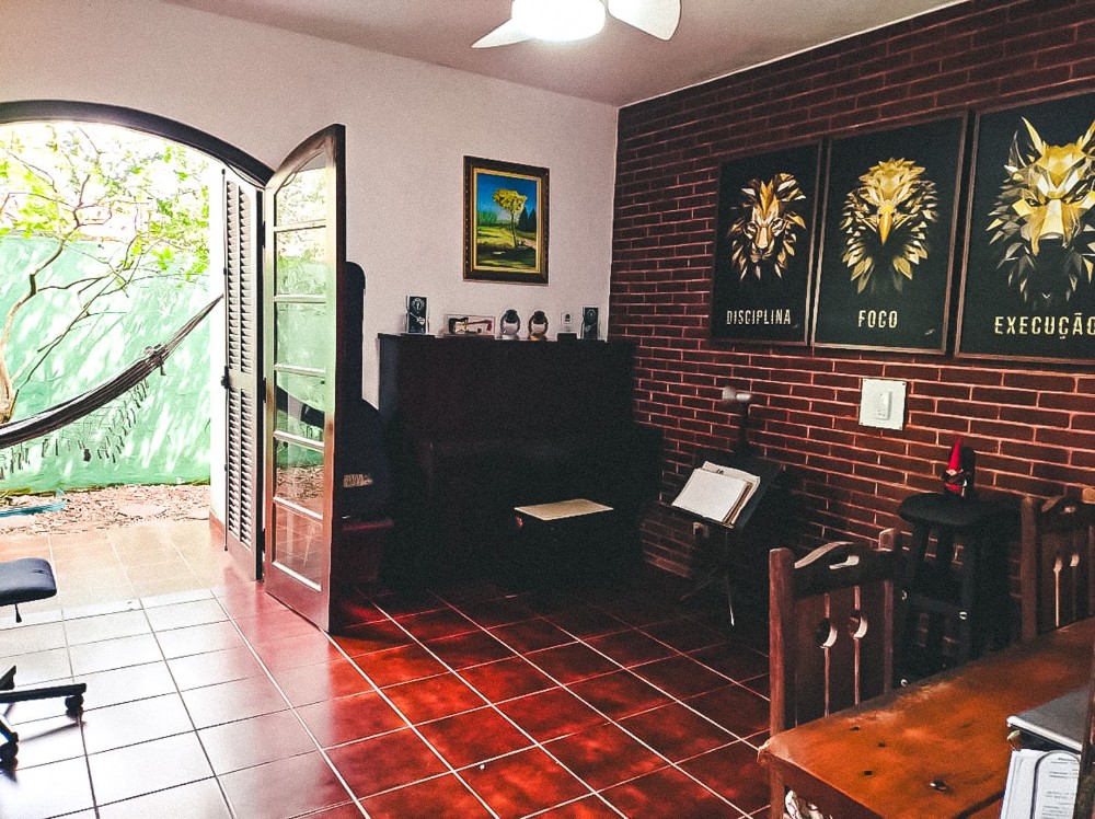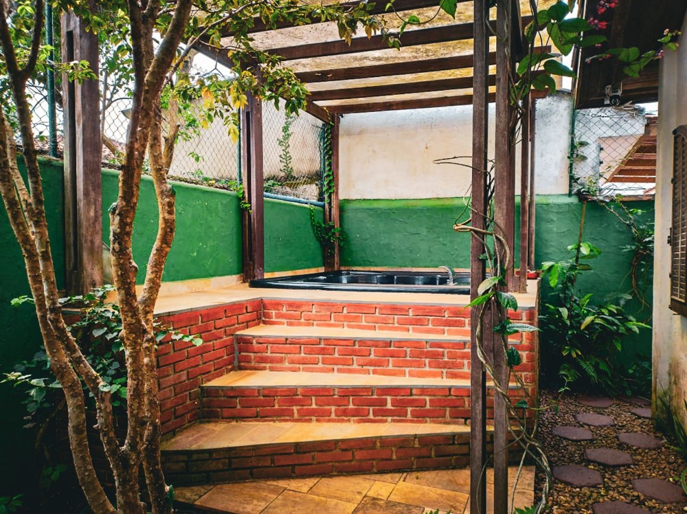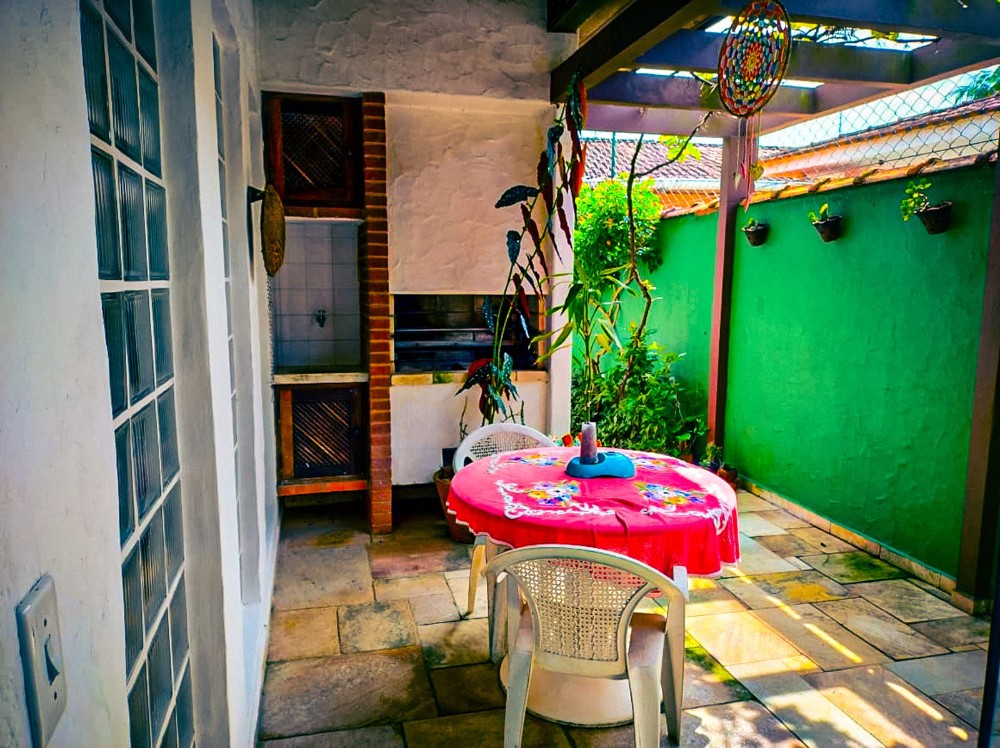 O jardim envolve toda a propriedade, trazendo um ambiente agradável e contato direto com a natureza, com árvores frutíferas que agregam charme e bem-estar ao espaço. O imóvel dispõe também de 2 vagas de garagem.