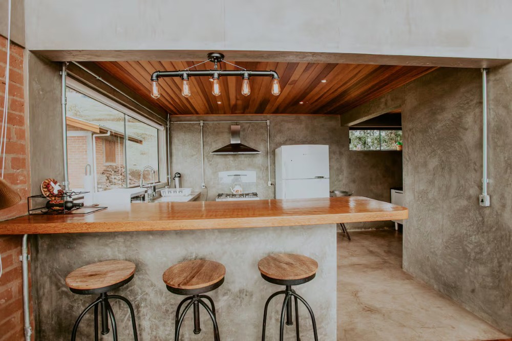 Área Social: Sala de estar com lareira integrada a uma cozinha americana totalmente equipada, ideal para momentos de convivência.
