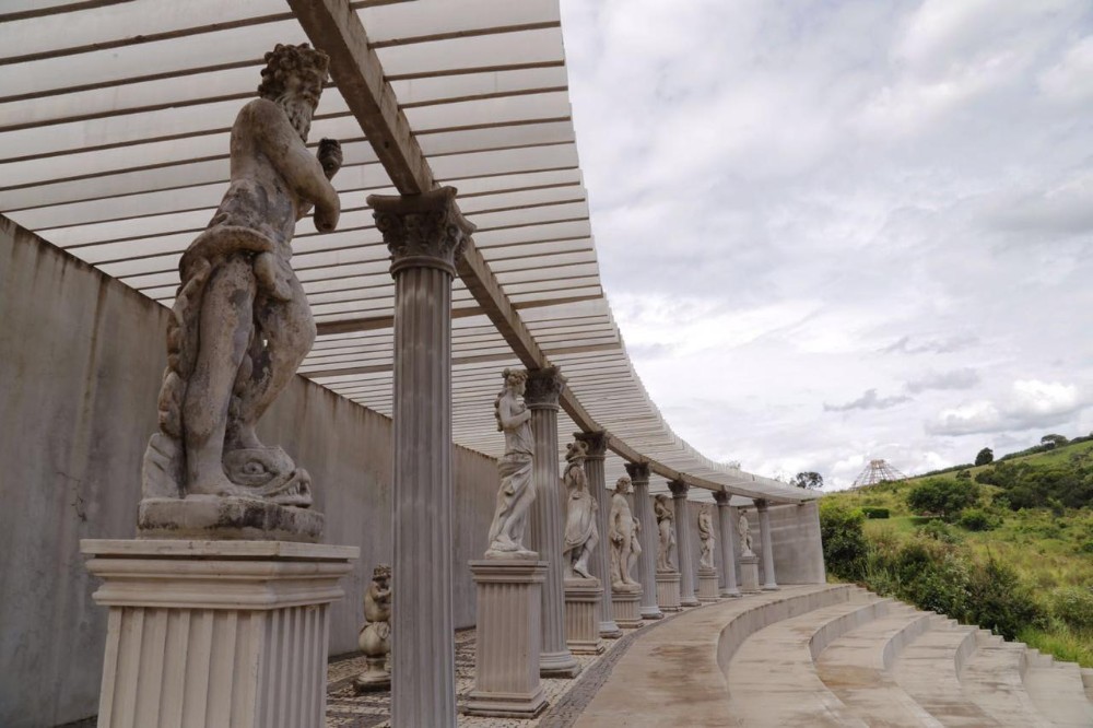 E então você entende que não é só uma propriedade. É uma experiência. Um Teatro Grego para 800 pessoas, palco de 120 metros, camarins subterrâneos, estátuas dos Deuses do Olimpo, concha acústica, Pedra Fundamental, Rosa dos 9 Ventos norteada. Um totem de 19 metros contando a história da humanidade. Labirinto vivo, réplica da Catedral de Amiens, Pirâmide de Quéops em 10% do tamanho original.