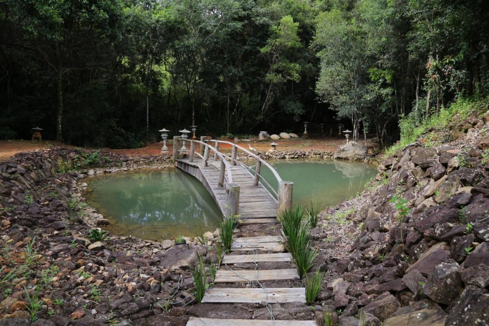 Aqui a água canta. Uma cachoeira com 10 metros de queda desenha o cenário, enquanto o lago japonês, abastecido por nascente, reflete o céu e a calma do lugar. É silêncio, é paz, é aquela sensação de que o tempo desacelera e a alma respira.
