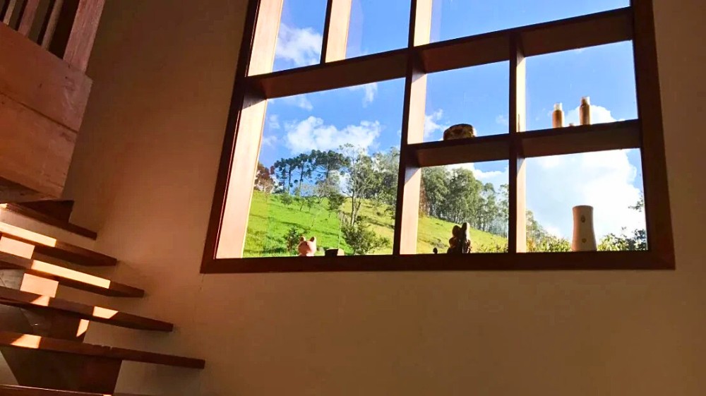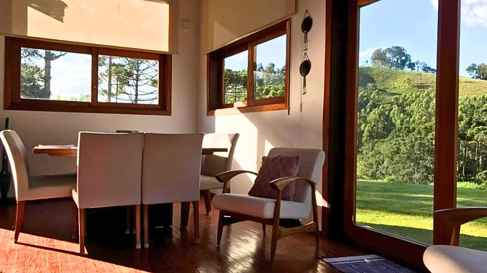 No topo de seus mais de 24.000 m², a casa se apresenta como um exercício de elegância e funcionalidade. Projetada para quem valoriza o conforto sem excessos, ela integra ambientes de forma fluida: a luz do entardecer invade a sala, enquanto o mezanino em madeiras nobres oferece o silêncio necessário para um escritório ou ateliê. Cada janela foi posicionada para que a paisagem — composta por araucárias e um céu vasto — seja a protagonista.
